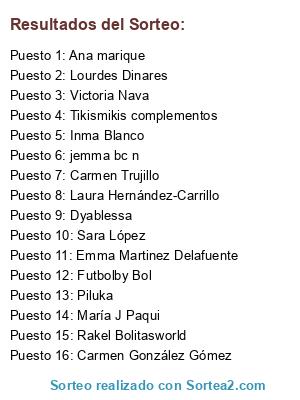 Lista de participantes: María J Paqui, Piluka, Carmen González Gómez, Sara López, Rakel Bolitasworld, Inma Blanco, Emma Martinez Delafuente, Victoria Nava, jemma bc n, Dyablessa, Laura Hernández-Carrillo, Lourdes Dinares, Tikismikis complementos, Ana marique, Futbolby Bol, Carmen Trujillo.