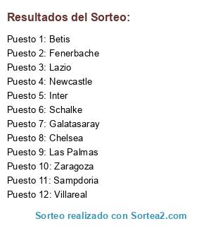 Lista de participantes: Betis, Schalke, Lazio, Las Palmas, Villareal, Zaragoza, Fenerbache, Newcastle, Galatasaray, Sampdoria, Inter, Chelsea.