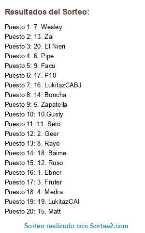 Lista de participantes: 1. Ebner, 2. Geer, 3. Fruter, 4. Medra, 5. Zapatella, 6. Pipe, 7. Wesley, 8. Rayo, 9. Facu, 10.Gusty, 11. Seto, 12. Ruso, 13. Zai, 14. Boncha, 15. Matt, 16. LukitazCABJ, 17. P10, 18. Baime, 19. LukitazCAI, 20. El Nieri.