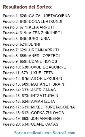 Lista de participantes: 609 MAITANE ITURAIN, 610 NAHIKARI EIZAGUIRRE, 611 SUHAR ESNAOLA, 612 GORKA ZULOAGA, 613 ANDER ESPOSITO, 614 NAHIA EIZMENDI, 615 NEREA MUJICA, 616 OINATZ ARRUTI, 617 IDIOIA FERNANDEZ, 618 AROA FERNANDEZ, 619 AIZEA ZINKUNEGI, 620 AMETS ITURAIN, 621 JENNI, 622 OIER IZETA, 623 IÑAKI URBIETA, 624 AIMAR IZETA, 625 AIMAR IRURETAGOIENA, 626 GAIZA IURETAGOIENA, 627 MANEX ALBENIZ, 628 UNAI ALBENIZ, 629 URGAIN ARRUTI, 630 XABIER GIL, 631 MIKEL IRURETAGOIENA, 632 TXUS CAÑAS, 633 ANER CAÑAS, 634 UDANE CAÑAS, 635 ODEI ALKORTA, 636 BEÑAT ALKORTA, 637 ALBERTO REBOLLO, 638 UXUE EIZAGUIRRE, 639 UXUE ALBENIZ, 640 JOANE AIERTZA, 641 BEÑAT ARRUTI, 642 IXANE ESTEBERENA, 643 IZASKUN ITURRIOZ, 645 ANA ITURRIOZ, 646 IURGI URIA, 647 EKIOTZ ARRUTI, 648 EKI AIZPURU, 649 DONA LERTXUNDI, 650 ALLENDE LERTXUNDI, 651 XANTI ZABALETA, 653 JUAN MARI IZETA, 654 KAUTAR KAUTAR, 655 NAIARA IRURETAGOIENA, 656 LEIRE ARRUTI, 657 AINHOA GONZALEZ DE TXABARRI, 658 ESTITXU MARKEZ, 659 UDANE HOYOS, 660 ALEX HOYOS, 661 XABI ALDAI, 662 NAROA EIZAGUIRRE, 663 JON ARANBERRI, 664 GARAZI EIZMENDI, 665 AIMAR ARANBERRI, 666 AITZOL IRURETAGOINA, 667 IKER ARRUTI, 668 JOAQUIN DEL BARRIO, 669 URKO DEL BARRIO, 670 IKER ZULOAGA, 671 NORA ZULOAGA, 672 ARANTXA ZULOAGA, 673 INTZA ITURAIN, 674 IGOR ITURAIN, 675 AITOR UZKUDUN, 676 OIER AZPIROZ, 677 KEPA ARRUTI, 678 EÑAUT IZETA, 679 UXUE IZETA, 680 LOITZ EIZAGUIRRE, 681 AXIER ARRUTI, 682 MAREN ESTEBERENA, 683 MIKEL IRURETAGOIENA, 684 UNAX LOPETEGI, 685 ANER LOPETEGI, 686 NEREA CUBERO, 687 MAIALEN CUBERO, 688 SERGIO CUBERO, 689 LAURENTXI ITURAIN, 690 AINHOA UBEGUN, 691 JULEN GOMEZ, 692 GORKA OLASAGASTI, 693 KEPA EIZAGUIRRE, 694 IMANOL IRURETAGOIENA.