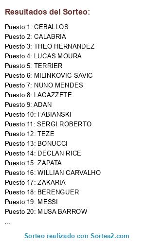 Lista de participantes: FABIANSKI, ADAN, THEO HERNANDEZ, NUNO MENDES, TEZE, BONUCCI, CALABRIA, SERGI ROBERTO, KIMPEMBE, BERENGUER, DECLAN RICE, WILLIAN CARVALHO, MILINKOVIC SAVIC, CEBALLOS, ZAKARIA, LACAZZETE, ZAPATA, TERRIER, MUSA BARROW, MESSI, LUCAS MOURA.