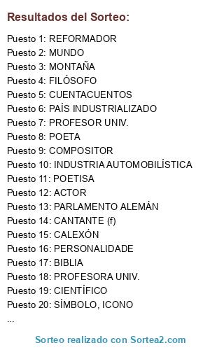 Lista de participantes: POETA , CUENTACUENTOS , COMPOSITOR , PINTOR , FILÓSOFO , SACERDOTE , PROFESOR UNIV. , REFORMADOR , CANTANTE (m) , ACTOR , CIENTÍFICO , ALCUME , NOVELA , MONTAÑA , RÍO , PORTO , HABITANTE , PARLAMENTO ALEMÁN , RAMA INDUSTRIAL , FABRICANTE DE COCHES , POETISA , COMPOSITORA , PINTORA , FILÓSOFA , PROFESORA UNIV. , CANTANTE (f) , ACTRIZ , CIENTÍFICA , PERSONALIDADE , BIBLIA , TEORÍA DA RELATIVIDADE , SINFONÍA , MUNDO , CALEXÓN , IGREXA , MURALLA, MURO , CAPITAL , FEIRA DO LIBRO , REUNIFICACIÓN , INDUSTRIA AUTOMOBILÍSTICA , EXPOSICIÓN DE COCHES , IMAXE, CADRO , MUSEO , SÍMBOLO, ICONO , FESTA POPULAR , PAÍS INDUSTRIALIZADO.