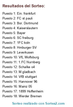 Lista de participantes: 1FC koln, 1.FC Nurnberg, 1899 Hoffenheim, Bayer, Bor. Dortmund, Ein. frankfurt, FC st pauli, Hmburger SV, Hannover 96, Kaiserslautern, Leverkusen, M.gladbach, Mainz 05, Schalke o4, SC freiburg, VfB stuttgart, VfL Wolfsburg, Werder Bremen.