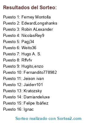 Lista de participantes: Ignac, Hugo A. S., Hugito,enzo, EdwardLongshanks, Damiandeluxe, Weito36, Robin ALexander, Kratozsky, Jeison ivan, Pagj34, Rffvfv, NicolasRey9, Felipe Ibáñez, Fernandito778982, Ferney Montolla, Jaiderr101.