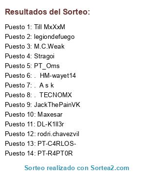 Lista de participantes: . TECNOMX , PT-R4PT0R , DL-K1ll3r, Stragoi , Neoluka , legiondefuego , Till MxXxM , M.C.Weak , . A s k , Maxesar , . HM-wayet14, PT_Oms , 0C3S4R, PT-C4RLOS- , JackThePainVK , rodri.chavezvil.