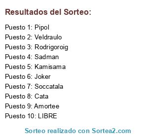 Lista de participantes: Amortee, Joker, Pipol, Kamisama, Veldruuk, Rodrigoroig, Cata, Soccatala, Sadman, LIBRE.