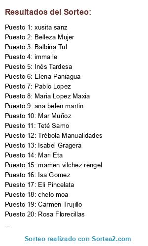 Lista de participantes: latika fondue(3 participaciones), chelo moa(6 participaciones), Mar Muñoz(6 participaciones), Xandratelier Shop On Line(6 participaciones), esther hdez(2 participaciones), Elena Paniagua(3 participaciones), Nurialombana(2 participaciones), DARMY COLINA(3 participaciones), Nerea González Cortina(3 participaciones), mamen vilchez rengel(3 participaciones), Isa Gomez(3 participaciones), ana belen martin(3 participaciones), Laia Ferrer Meseguer(3 participaciones), chari perez quiros(3 participaciones), Maria Lopez Maxia(6 participaciones), MariaRosa Fdz y algún apellido más(3 participaciones), Gato Negro(3 participaciones), Elena Mesa(3 participaciones), Elenita Rodriguez(2 participaciones), Carmen Trujillo(3 participaciones), Esther(3 participaciones), Afilando mis tacones(3 participaciones), Vereda Mare(3 participaciones), Fina Quintanar Meco(2 participaciones), Rosi Luna(3 participaciones), Belleza Mujer(6 participaciones), Adela Ruiz(3 participaciones), Pablo Lopez(3 participaciones), Amapola Ocho(3 participaciones), Eli Pincelata(3 participaciones), Fermina Perez(3 participaciones), Trébola Manualidades(6 participaciones), Cherry Bloom(3 participaciones), xusita sanz(3 participaciones), Patricia Oseas(2 participaciones), Balbina Tul(3 participaciones), Esther Blue(3 participaciones), Mari Nicol(3 participaciones), Inés Tardesa(3 participaciones), Alacena Recetas(6 participaciones), nuria garcia nicolas(3 participaciones), Rita Rubi(3 participaciones), Ana Tejasfin(3 participaciones), Teté Samo(3 participaciones), Nadia de la Orden(3 participaciones), Rosa Florecillas(3 participaciones), Villa Maresilla(6 participaciones), Cinthia Lopez(3 participaciones), imma le(3 participaciones), Mari Eta(3 participaciones), Violeta Rubio(3 participaciones), Elisa Ruiz(6 participaciones), yaxkin(3 participaciones), Paqui Risquez(3 participaciones), Nuria Garcia Buendia(2 participaciones), Cristina Palomares(3 participaciones), Maria Coronada Rosa(3 participaciones), Isabel Gragera(3 participaciones), Jessi Cortés Fernández(3 participaciones), Elena Lopez Hazas(2 participaciones), Carmen González Gómez(2 participaciones).