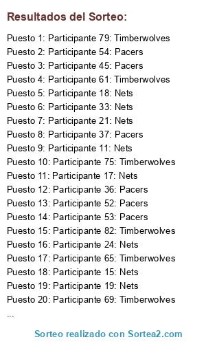 Lista de participantes: Participante 1: Nets, Participante 2: Nets, Participante 3: Nets, Participante 4: Nets, Participante 5: Nets, Participante 6: Nets, Participante 7: Nets, Participante 8: Nets, Participante 9: Nets, Participante 10: Nets, Participante 11: Nets, Participante 12: Nets, Participante 13: Nets, Participante 14: Nets, Participante 15: Nets, Participante 16: Nets, Participante 17: Nets, Participante 18: Nets, Participante 19: Nets, Participante 20: Nets, Participante 21: Nets, Participante 22: Nets, Participante 23: Nets, Participante 24: Nets, Participante 25: Nets, Participante 26: Nets, Participante 27: Nets, Participante 28: Nets, Participante 29: Nets, Participante 30: Nets, Participante 31: Nets, Participante 32: Nets, Participante 33: Nets, Participante 34: Nets, Participante 35: Nets, Participante 36: Pacers, Participante 37: Pacers, Participante 38: Pacers, Participante 39: Pacers, Participante 40: Pacers, Participante 41: Pacers, Participante 42: Pacers, Participante 43: Pacers, Participante 44: Pacers, Participante 45: Pacers, Participante 46: Pacers, Participante 47: Pacers, Participante 48: Pacers, Participante 49: Pacers, Participante 50: Pacers, Participante 51: Pacers, Participante 52: Pacers, Participante 53: Pacers, Participante 54: Pacers, Participante 55: Pacers, Participante 56: Pacers, Participante 57: Timberwolves, Participante 58: Timberwolves, Participante 59: Timberwolves, Participante 60: Timberwolves, Participante 61: Timberwolves, Participante 62: Timberwolves, Participante 63: Timberwolves, Participante 64: Timberwolves, Participante 65: Timberwolves, Participante 66: Timberwolves, Participante 67: Timberwolves, Participante 68: Timberwolves, Participante 69: Timberwolves, Participante 70: Timberwolves, Participante 71: Timberwolves, Participante 72: Timberwolves, Participante 73: Timberwolves, Participante 74: Timberwolves, Participante 75: Timberwolves, Participante 76: Timberwolves, Participante 77: Timberwolves, Participante 78: Timberwolves, Participante 79: Timberwolves, Participante 80: Timberwolves, Participante 81: Timberwolves, Participante 82: Timberwolves, Participante 83: Timberwolves, Participante 84: Timberwolves, Participante 85: Timberwolves, Participante 86: Timberwolves, Participante 87: Timberwolves, Participante 88: Timberwolves, Participante 89: Timberwolves.