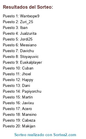 Lista de participantes: Happy, Messiano, Stoyayuvic, Dani, Zuri_25, Acero, Papiyorchu, Cuban, Euskalplayer, Javiixu, Jhoel, Jordi25, Jualzurita, Davichu, Cabeza, Iban, Martin, Mansino, Wantxope9, Makijan.