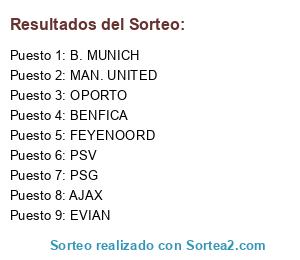 Lista de participantes: B. MUNICH, MAN. UNITED, FEYENOORD, OPORTO, EVIAN, BENFICA, PSG, AJAX, PSV.