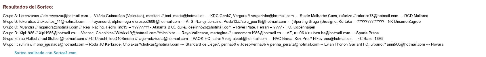 Lista de participantes: @jandra, @Xipi1986, @lagometavuela, @vergarinho, @roig.albert, @rafarizo78, @crespo2608, @mono_igualada, @delreycozar, @ruuben.ba, @joselinho26, @raul.9futbol, @selu_peu18, @cholikas, @anni500, @penha_peralta, @Nikev-pes, @juanromero1986, @Wiwixx19, @toni_marta, @tokecitos_11, Ferrari -- ???? - F.C. Copenhagen, Pedro_sfc19 -- ???????? - Atalanta B.C., Kortako -- ????????????? - NK Dinamo Zagreb.