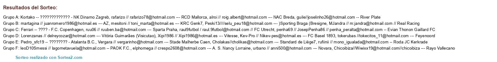 Lista de participantes: @jandra, @Xipi1986, @lagometavuela, @vergarinho, @roig.albert, @rafarizo78, @crespo2608, @mono_igualada, @delreycozar, @ruuben.ba, @joselinho26, @raul.9futbol, @selu_peu18, @cholikas, @anni500, @penha_peralta, @Nikev-pes, @juanromero1986, @Wiwixx19, @toni_marta, @tokecitos_11, Ferrari -- ???? - F.C. Copenhagen, Pedro_sfc19 -- ???????? - Atalanta B.C., Kortako -- ????????????? - NK Dinamo Zagreb.