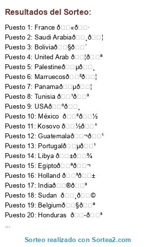 Lista de participantes: Belgium🇧🇪, Tunisia 🇹🇳, México 🇲🇽, Honduras 🇭🇳, Libya 🇱🇾, India🇮🇳, Holland 🇳🇱, Bosnia & Herzegovina🇧🇦, Croatia 🇭🇷, Portugal🇵🇹, France 🇫🇷, Indonesia🇮🇩, Egipto🇪🇬, Iran🇮🇷, Saudi Arabia🇸🇦, United Arab 🇦🇪, Peru🇵🇪, Kosovo 🇽🇰, Marruecos🇲🇦, Nicaragua 🇳🇮, Bolivia🇧🇴, Sudan 🇸🇩, Panama🇵🇦, Guatemala🇬🇹, España🇪🇸, USA🇺🇸, Yemen🇾🇪, Palestine🇵🇸.