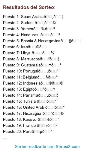 Lista de participantes: Belgium🇧🇪, Tunisia 🇹🇳, México 🇲🇽, Honduras 🇭🇳, Libya 🇱🇾, India🇮🇳, Holland 🇳🇱, Bosnia & Herzegovina🇧🇦, Croatia 🇭🇷, Portugal🇵🇹, France 🇫🇷, Indonesia🇮🇩, Egipto🇪🇬, Iran🇮🇷, Saudi Arabia🇸🇦, United Arab 🇦🇪, Peru🇵🇪, Kosovo 🇽🇰, Marruecos🇲🇦, Nicaragua 🇳🇮, Bolivia🇧🇴, Sudan 🇸🇩, Panama🇵🇦, Guatemala🇬🇹, España🇪🇸, USA🇺🇸, Yemen🇾🇪, Palestine🇵🇸.
