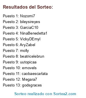 Lista de participantes: VickyDEmyl, GarciaC10, ernovels, AryZabel, godsgraces, Nozomi7, NinaBenedetta1, molly, Megara7, uutopicaa, bileysireyes, beatricelebrun, caobaescarlata.