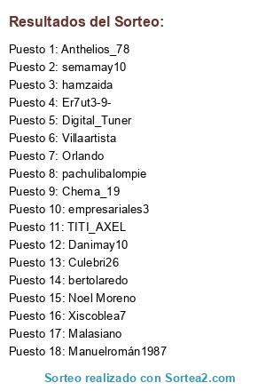 Lista de participantes: empresariales3, Culebri26, bertolaredo, Xiscoblea7, semamay10, pachulibalompie, Digital_Tuner, Chema_19, Danimay10, Villaartista, Er7ut3-9-, Manuelromán1987, hamzaida, TITI_AXEL, Malasiano, Anthelios_78, Noel Moreno, Orlando.