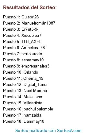 Lista de participantes: empresariales3, Culebri26, bertolaredo, Xiscoblea7, semamay10, pachulibalompie, Digital_Tuner, Chema_19, Danimay10, Villaartista, Er7ut3-9-, Manuelromán1987, hamzaida, TITI_AXEL, Malasiano, Anthelios_78, Noel Moreno, Orlando.