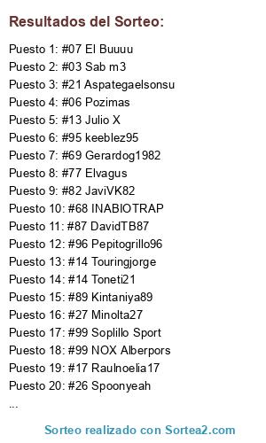 Lista de participantes: #07 El Buuuu, #88 Caraja1, #87 DavidTB87, #27 Minolta27, #82 JaviVK82, #14 Toneti21, #69 Gerardog1982, #42 RoberAstur, #77 Elvagus, #99 NOX Alberpors, #68 INABIOTRAP, #21 Aspategaelsonsu, #17 Raulnoelia17, #26 Spoonyeah, #89 Kintaniya89, #03 Sab m3, #13 Julio X, #06 Pozimas, #99 Soplillo Sport, #96 Pepitogrillo96, #14 Touringjorge, #95 keeblez95.