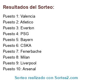 Lista de participantes: Liverpool, CSKA, Atletico, Bayern, PSG, Arsenal, Valencia, Everton, Fenerbache, Milan.