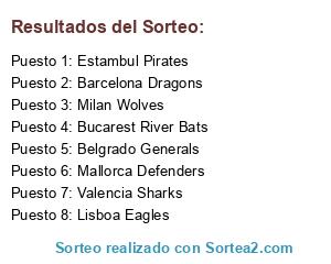 Lista de participantes: MILAN WOLVES, MALLORCA DEFENDERS, MANCHESTER RED DEVILS, STOCKHOLM MOOSE, MONACO ROULETTES, RIVER BATS, AMSTERDAM VIPERS, BARCELONA DRAGONS, ROMA SENATORS, ZAGREB TITANS, BELGRADO GENERALS, VALENCIA SHARKS, VAROSVIA ICE TIGERS, PARIS MOUSQUETAIRES, ESTAMBUL PIRATES, OSLO VIKINGS.