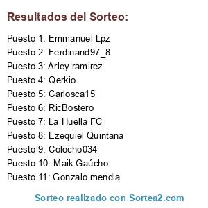 Lista de participantes: Ezequiel Quintana, Emmanuel Lpz, Colocho034, Gonzalo mendia, Carlosca15, Qerkio, Maik Gaúcho, La Huella FC, Ferdinand97_8, RicBostero, Arley ramirez.