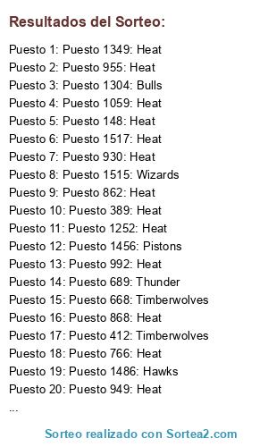 Lista de participantes: Puesto 1: Heat, Puesto 2: Spurs, Puesto 3: Nets, Puesto 4: Heat, Puesto 5: Heat, Puesto 6: Heat, Puesto 7: Heat, Puesto 8: Heat, Puesto 9: Timberwolves, Puesto 10: Heat, Puesto 11: Heat, Puesto 12: Heat, Puesto 13: Timberwolves, Puesto 14: Timberwolves, Puesto 15: Magic, Puesto 16: Bulls, Puesto 17: Hawks, Puesto 18: Heat, Puesto 19: Heat, Puesto 20: Hawks, Puesto 21: Heat, Puesto 22: Spurs, Puesto 23: Heat, Puesto 24: Heat, Puesto 25: Magic, Puesto 26: Heat, Puesto 27: Nets, Puesto 28: Bulls, Puesto 29: Raptors, Puesto 30: Heat, Puesto 31: Heat, Puesto 32: Spurs, Puesto 33: Timberwolves, Puesto 34: Bulls, Puesto 35: Heat, Puesto 36: Heat, Puesto 37: Heat, Puesto 38: Heat, Puesto 39: Nets, Puesto 40: Heat, Puesto 41: Heat, Puesto 42: Heat, Puesto 43: Timberwolves, Puesto 44: Heat, Puesto 45: Heat, Puesto 46: Heat, Puesto 47: Heat, Puesto 48: Heat, Puesto 49: Heat, Puesto 50: Nets, Puesto 51: Timberwolves, Puesto 52: Heat, Puesto 53: Raptors, Puesto 54: Heat, Puesto 55: Nets, Puesto 56: Heat, Puesto 57: Heat, Puesto 58: Heat, Puesto 59: Heat, Puesto 60: Nets, Puesto 61: Heat, Puesto 62: Heat, Puesto 63: Hawks, Puesto 64: Heat, Puesto 65: Heat, Puesto 66: Heat, Puesto 67: Timberwolves, Puesto 68: Nets, Puesto 69: Heat, Puesto 70: Heat, Puesto 71: Heat, Puesto 72: Heat, Puesto 73: Timberwolves, Puesto 74: Heat, Puesto 75: Nets, Puesto 76: Heat, Puesto 77: Heat, Puesto 78: Heat, Puesto 79: Spurs, Puesto 80: Hawks, Puesto 81: Bulls, Puesto 82: Heat, Puesto 83: Timberwolves, Puesto 84: Spurs, Puesto 85: Heat, Puesto 86: Heat, Puesto 87: Heat, Puesto 88: Raptors, Puesto 89: Heat, Puesto 90: Heat, Puesto 91: Heat, Puesto 92: Heat, Puesto 93: Heat, Puesto 94: Raptors, Puesto 95: Bulls, Puesto 96: Heat, Puesto 97: Raptors, Puesto 98: Heat, Puesto 99: Heat, Puesto 100: Heat, Puesto 101: Heat, Puesto 102: Heat, Puesto 103: Nets, Puesto 104: Heat, Puesto 105: Timberwolves, Puesto 106: Heat, Puesto 107: Raptors, Puesto 108: Heat, Puesto 109: Heat, Puesto 110: Heat, Puesto 111: Heat, Puesto 112: Heat, Puesto 113: Heat, Puesto 114: Heat, Puesto 115: Heat, Puesto 116: Heat, Puesto 117: Heat, Puesto 118: Heat, Puesto 119: Heat, Puesto 120: Heat, Puesto 121: Magic, Puesto 122: Heat, Puesto 123: Heat, Puesto 124: Nets, Puesto 125: Nets, Puesto 126: Heat, Puesto 127: Heat, Puesto 128: Heat, Puesto 129: Timberwolves, Puesto 130: Heat, Puesto 131: Bulls, Puesto 132: Heat, Puesto 133: Heat, Puesto 134: Heat, Puesto 135: Heat, Puesto 136: Nets, Puesto 137: Heat, Puesto 138: Heat, Puesto 139: Heat, Puesto 140: Raptors, Puesto 141: Heat, Puesto 142: Heat, Puesto 143: Heat, Puesto 144: Heat, Puesto 145: Bulls, Puesto 146: Heat, Puesto 147: Heat, Puesto 148: Hawks, Puesto 149: Heat, Puesto 150: Heat, Puesto 151: Heat, Puesto 152: Heat, Puesto 153: Timberwolves, Puesto 154: Heat, Puesto 155: Heat, Puesto 156: Heat, Puesto 157: Heat, Puesto 158: Hawks, Puesto 159: Magic, Puesto 160: Heat, Puesto 161: Heat, Puesto 162: Heat, Puesto 163: Heat, Puesto 164: Heat, Puesto 165: Spurs, Puesto 166: Heat, Puesto 167: Bulls, Puesto 168: Heat, Puesto 169: Heat, Puesto 170: Raptors, Puesto 171: Heat, Puesto 172: Nets, Puesto 173: Heat, Puesto 174: Heat, Puesto 175: Heat, Puesto 176: Heat, Puesto 177: Heat, Puesto 178: Heat, Puesto 179: Heat, Puesto 180: Heat, Puesto 181: Heat, Puesto 182: Spurs, Puesto 183: Heat, Puesto 184: Magic, Puesto 185: Spurs, Puesto 186: Heat, Puesto 187: Heat, Puesto 188: Heat, Puesto 189: Heat, Puesto 190: Raptors, Puesto 191: Heat, Puesto 192: Heat, Puesto 193: Heat, Puesto 194: Heat, Puesto 195: Heat, Puesto 196: Heat, Puesto 197: Nets, Puesto 198: Heat, Puesto 199: Heat, Puesto 200: Heat, Puesto 201: Heat, Puesto 202: Magic, Puesto 203: Timberwolves, Puesto 204: Heat, Puesto 205: Heat, Puesto 206: Heat, Puesto 207: Magic, Puesto 208: Heat, Puesto 209: Heat, Puesto 210: Timberwolves, Puesto 211: Magic, Puesto 212: Nets, Puesto 213: Spurs, Puesto 214: Hawks, Puesto 215: Heat, Puesto 216: Heat, Puesto 217: Timberwolves, Puesto 218: Hawks, Puesto 219: Hawks, Puesto 220: Heat, Puesto 221: Heat, Puesto 222: Heat, Puesto 223: Raptors, Puesto 224: Heat, Puesto 225: Nets, Puesto 226: Heat, Puesto 227: Heat, Puesto 228: Heat, Puesto 229: Heat, Puesto 230: Heat, Puesto 231: Heat, Puesto 232: Heat, Puesto 233: Timberwolves, Puesto 234: Heat, Puesto 235: Heat, Puesto 236: Heat, Puesto 237: Heat, Puesto 238: Heat, Puesto 239: Heat, Puesto 240: Heat, Puesto 241: Raptors, Puesto 242: Heat, Puesto 243: Heat, Puesto 244: Hawks, Puesto 245: Nets, Puesto 246: Bulls, Puesto 247: Spurs, Puesto 248: Heat, Puesto 249: Heat, Puesto 250: Bulls, Puesto 251: Heat, Puesto 252: Heat, Puesto 253: Heat, Puesto 254: Timberwolves, Puesto 255: Heat, Puesto 256: Heat, Puesto 257: Heat, Puesto 258: Timberwolves, Puesto 259: Heat, Puesto 260: Hawks, Puesto 261: Heat, Puesto 262: Heat, Puesto 263: Heat, Puesto 264: Heat, Puesto 265: Timberwolves, Puesto 266: Bulls, Puesto 267: Timberwolves, Puesto 268: Heat, Puesto 269: Bulls, Puesto 270: Bulls, Puesto 271: Timberwolves, Puesto 272: Heat, Puesto 273: Magic, Puesto 274: Spurs, Puesto 275: Heat, Puesto 276: Nets, Puesto 277: Magic, Puesto 278: Heat, Puesto 279: Heat, Puesto 280: Heat, Puesto 281: Heat, Puesto 282: Heat, Puesto 283: Heat, Puesto 284: Heat, Puesto 285: Timberwolves, Puesto 286: Heat, Puesto 287: Nets, Puesto 288: Heat, Puesto 289: Magic, Puesto 290: Heat, Puesto 291: Heat, Puesto 292: Heat, Puesto 293: Heat, Puesto 294: Heat, Puesto 295: Nets, Puesto 296: Heat, Puesto 297: Heat, Puesto 298: Heat, Puesto 299: Timberwolves, Puesto 300: Spurs, Puesto 301: Heat, Puesto 302: Heat, Puesto 303: Heat, Puesto 304: Heat, Puesto 305: Timberwolves, Puesto 306: Spurs, Puesto 307: Heat, Puesto 308: Raptors, Puesto 309: Raptors, Puesto 310: Heat, Puesto 311: Heat, Puesto 312: Heat, Puesto 313: Heat, Puesto 314: Heat, Puesto 315: Heat, Puesto 316: Heat, Puesto 317: Raptors, Puesto 318: Heat, Puesto 319: Heat, Puesto 320: Heat, Puesto 321: Raptors, Puesto 322: Nets, Pue
