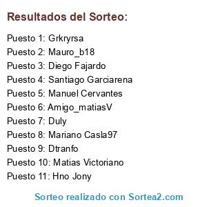 Lista de participantes: Matias Victoriano, Grkryrsa, Mariano Casla97, Manuel Cervantes, Dtranfo, Duly, Diego Fajardo, Santiago Garciarena, Hno Jony, Mauro_b18, Amigo_matiasV.
