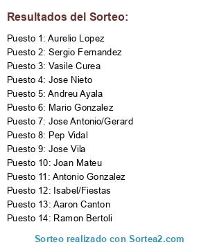 Lista de participantes: Jose Nieto, Sergio Fernandez, Vasile Curea, Aurelio Lopez, Aaron Canton, Isabel/Fiestas, Ramon Bertoli, Antonio Gonzalez, Jose Vila, Jose Antonio/Gerard, Pep Vidal, Joan Mateu, Mario Gonzalez, Andreu Ayala.
