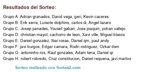 Lista de participantes: Adam tena, Raul gonzales, cachorro de leon, Kevin caceres, carlos di, Daniel qm, paul andy, Daniel qr, Erik serra, Luisote dolphins, Daniel gonzalez, Miguel blasco, Jose joaquin, Ozkar dsm, Ibai rosas, David vega, Edgar camara, yohan vallejo, antoninho ros, Josep panades, robert robredo, Angel lazaro, Yousef gabari, Xavi ville, javi martos, Cruz constitucion, christian mayol, Rodri rodriguez, javi burgos, Daniel requena, Adrian granados, geri.