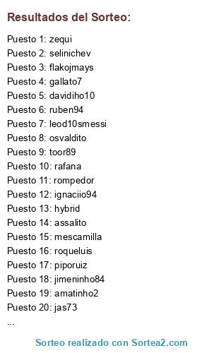 Lista de participantes: toor89, davidiho10, osvaldito, piporuiz, sefirottt, zequi, roqueluis, hybrid, gallato7, ignaciio94, leod10smessi, flakojmays, ruben94, rafana, cipotti, mescamilla, iru, rompedor, jas73, selinichev, assalito, jimeninho84, rizopas, amatinho2.