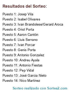 Lista de participantes: José Garcia Nieto, Aaron Cantón, Nico Martinez, Antonio Gonzalez, Josep Vila, Andreu Ayala, Ivan Brandolese/Gerard Aroca, Lluis Serrano, Oriol Porta, Pep Vidal, Genis Porta, Antonio Fiestas, Isabel Olivares, Ivan Porcar.