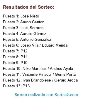 Lista de participantes: José Nieto, Antonio Gonzalez, Josep Vila / Eduard Merida, Aurelio Gómez, Aaron Canton, Niko Martinez / Andreu Ayala, Vincente Pinaqui / Genis Porta, Ivan Brandolese / Gerard Aroca, Lluis Serrano, P10, P11, P12, P13.