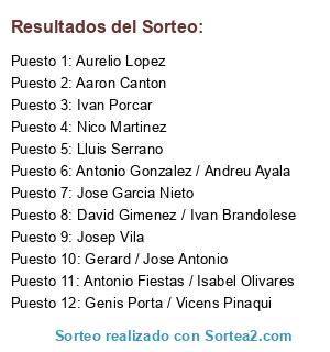 Lista de participantes: Antonio Gonzalez / Andreu Ayala, Aaron Canton, Jose Garcia Nieto, Josep Vila, David Gimenez / Ivan Brandolese, Nico Martinez, Aurelio Lopez, Gerard / Jose Antonio, Genis Porta / Vicens Pinaqui, Lluis Serrano, Antonio Fiestas / Isabel Olivares, Ivan Porcar.