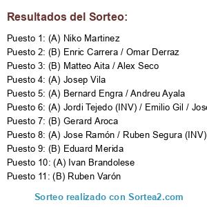 Lista de participantes: (A) Josep Vila, (B) Ruben Varón, (A) Niko Martinez, (B) Gerard Aroca, (B) Enric Carrera / Omar Derraz, (B) Matteo Aita / Alex Seco, (A) Jordi Tejedo (INV) / Emilio Gil / Jose Antonio, (A) Jose Ramón / Ruben Segura (INV), (B) Eduard Merida, (A) Bernard Engra / Andreu Ayala, (A) Ivan Brandolese.