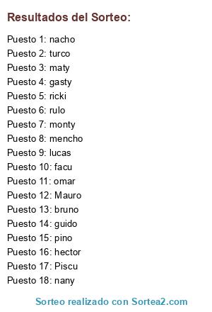 Lista de participantes: nany, turco, ricki, rulo, monty, pino, gasty, facu, nacho, mencho, omar, guido, bruno, hector, garri, lucas, maty, Mauro, Piscu.