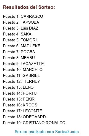 Lista de participantes: LENO, LECOMTE, MBABU, GABRIEL, TIERNEY, TOMORI, POGBA, TAPSOBA, CARRASCO, FEKIR, SAKA, MADUEKE, ODEGAARD, CRISTIANO RONALDO, LACAZETTE, PORTU, MARCELO, KROOS, Luis DIAZ.