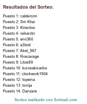 Lista de participantes: Kinectox, Abel_967, torrija, enri360, Sm Khai, a3boti, clockwork1904, calderonn, lopeina, oskarcbr, Litos89, kurosakicarlos, Roscarage, Danzare.