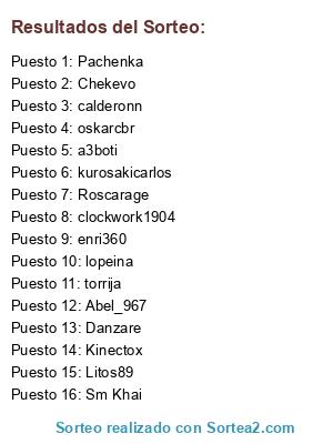 Lista de participantes: Kinectox, Abel_967, torrija, enri360, Sm Khai, a3boti, clockwork1904, calderonn, lopeina, oskarcbr, Litos89, kurosakicarlos, Roscarage, Danzare, Chekevo, Pachenka.