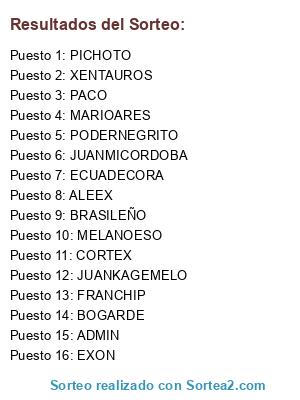Lista de participantes: ADMIN, MARIOARES, BRASILEÑO, CORTEX, JUANMICORDOBA, PICHOTO, ALEEX, PODERNEGRITO, PACO, FRANCHIP, EXON, ECUADECORA, JUANKAGEMELO, XENTAUROS, MELANOESO, BOGARDE.