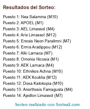 Lista de participantes: APOEL (M1), Omonia Nicosia (M1), AEK Larnaca (M4), AEL Limassol (M4), Anorthosis Famagusta (M4), Alki Larnaca (M7), Apollon Limassol (M7), Enosis Neon Paralimni (M7), Doxa Katokopia (M10), Ethnikos Achna (M10), Nea Salamina (M10), AEK Kouklia (M12), Aris Limassol (M12), Ermis Aradippou (M12).