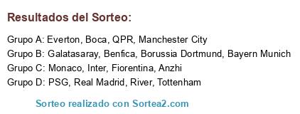 Lista de participantes: Boca, PSG, Real Madrid, QPR, Fiorentina, Benfica, Manchester City, Bayern Munich, Borussia Dortmund, River, Inter, Anzhi, Monaco, Everton, Galatasaray, Tottenham.