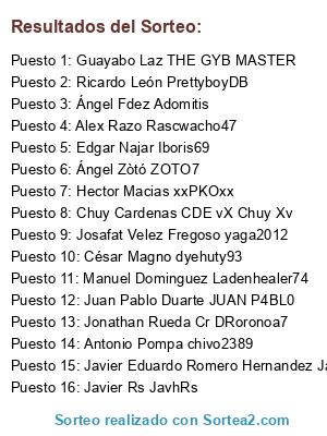 Lista de participantes: Ángel Zòtó ZOTO7, Alex Razo Rascwacho47, Manuel Dominguez Ladenhealer74, Ángel Fdez Adomitis, Chuy Cardenas CDE vX Chuy Xv, Ricardo León PrettyboyDB, Juan Pablo Duarte JUAN P4BL0, Javier Rs JavhRs, Javier Eduardo Romero Hernandez JavierRomero02, Edgar Najar Iboris69, César Magno dyehuty93, Hector Macias xxPKOxx, Guayabo Laz THE GYB MASTER, Antonio Pompa chivo2389, Josafat Velez Fregoso yaga2012, Jonathan Rueda Cr DRoronoa7.