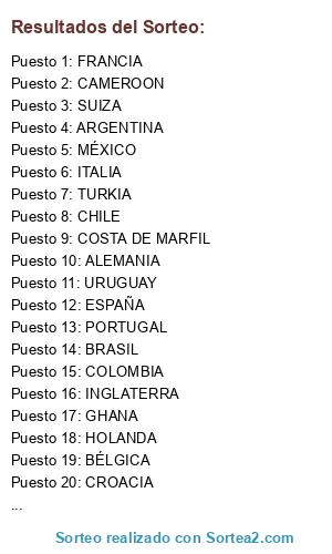 Lista de participantes: BRASIL, ARGENTINA, ESPAÑA, BÉLGICA, INGLATERRA, ITALIA, FRANCIA, PORTUGAL, HOLANDA, ALEMANIA, URUGUAY, COLOMBIA, COSTA DE MARFIL, CAMEROON, CHILE, GHANA, TURKIA, CROACIA, SUIZA, MÉXICO, SERBIA.