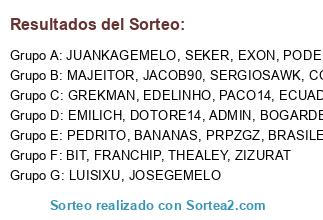 Lista de participantes: EDELINHO, GREKMAN, DOTORE14, FRANCHIP, BANANAS, EXON, CORTEX, ECUADECORA, JOSEGEMELO, JUANKAGEMELO, BRASILEÑO, PACO14, ADMIN, BIT, SERGIOSAWK, PEDRITO, ZIZURAT, MAJEITOR, BOGARDE, JACOB90, THEALEY, PODERNEGRITO, SEKER, EMILICH, PRPZGZ, LUISIXU.