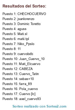 Lista de participantes: cuervobdb, aguss, Cuervo_Tatin, Mati.sl, farra_89, CABEZA, sebas+10, Mati_Elcuervo, Pola_cuervo, jsanlorenzo, axel_cuervo93, CHECHOCUERVO, Juan_Cuervo_10, Dominic Toretto, Niko_Ppslo, Cuervo [lc], matii.tpl, 11.