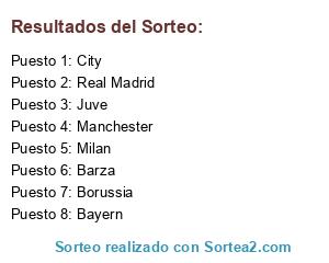 Lista de participantes: Barza, Real Madrid, Bayern, Milan, Juve, Manchester, City, Borussia.