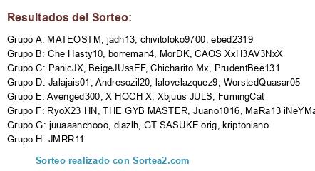 Lista de participantes: Juano1016, MATEOSTM, lalovelazquez9, PrudentBee131, ebed2319, GT SASUKE orig, WorstedQuasar05, CAOS XxH3AV3NxX, PanicJX, MorDK, RyoX23 HN, Avenged300, THE GYB MASTER, Jalajais01, Chicharito Mx, juuaaanchooo, Xbjuus JULS, chivitoloko9700, diazlh, borreman4, kriptoniano, Andresozil20, JMRR11, FumingCat, jadh13, Che Hasty10, X HOCH X, BeigeJUssEF, MaRa13 iNeYMaRx.