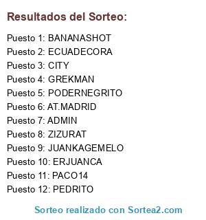 Lista de participantes: ECUADECORA, JUANKAGEMELO, ADMIN, PACO14, GREKMAN, BANANASHOT, AT.MADRID, PEDRITO, ERJUANCA, ZIZURAT, PODERNEGRITO, CITY.