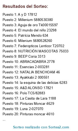 Lista de participantes: Peluquería Bravo TA672, Copiplus 43016, Irene juguetes regalos 148694, Irene juguetes regalos 148604, Deportes cronos 260958, Multiopticas 7317, Egumen peluqueros 49858, Foto-estudio karpint Tar-1400, Foto-estudio karpint T20-39565, DOVANA 2289, CONFECCIONES AURELIO 600, MC ZAPATOS 905, Fruteria mercadito T0403, aguja de oro TK00015581, Perfumería Esencias 2-003228, Abracadabra 2741, NAROGA 202,006,359, LUNA 2-027026, Juguetería Irene 000005/16-12-2020, Bellafarma T19/4195, Cesar Martín Alcala 9739, Librería Naroga 202,006,284, Farmacia Lda. Ma. Mercedes Pascual Echevarri D-051698, Frutería disfruta el mercadito M1T006, Frutería disfruta M1T007, Electrochash 73120, Comercial Pacheco 1402, Comercial Pacheco 1403, Retales Fran 8198, Dovana 2637, Peluquería Bravo 678, RETALES FRAN 8212, Bazar Sabbar 668, Gandarias 167448, Juguetería pamda 1704, Retales Fran textil y ropa de hogar 8213, Luna 2-027048, PRADO PLANTEL 9590, Idea coria TC 8840, Idea Coria 530597, Idea Coria 530599, Idea Coria 2889/ c, Deportes cronos 261100, Colorín colorado 2831, Calzados bernar 23252, Nutrición mascotas 75013, Nutrición mascotas 75015, Irene juguetes y regalos 148843, Sanguilinda retales 45046, Pm patricia mendo 612, Polo TC5/82754, Deportes cronos Cro/261137, Deportes cronos 261137, Deportes cronos Cro/261136, Teresa mayo T10/28116, Deportes cronos 261136, Retales fran 8193, Retales fran 8192, Dovana 2646, Confecciones Aurelio 868, Jugueteria pamda 1708, Juguetes Irene 000019 18-12-2020, Jugueteria pamda 1707, Mercería y lencería labores 90929, Fruteria mercadito T0019, Perfumhada 001522T, Le Velours 1-001343, FARMACIA MERCEDES PASCUAL D-018355, DOVANA 2645, Flichi Shop 1032, naroga 202006376, Flichi shop 1041, Retales fran 8224, Retales fran 7154, Retales fran 7155, Emilia perfumería 115408, Nutricion mascotas 75017, libreria Naroga 202006377, Prado plantel To0-9595, Los Malagueños T20/747, Le Velours 1-001344, Gandarias 167451, Nutricion mascotas 75018, Nutrición mascota 75021", Mercería lencería Labores 90935, Fruteria Mercadito M2-T0024, Fruteria Mercadito M2-T0025, El mundo del niño 23120, Confecciones Aurelio 886, Copiplus 43088, Superdroma 28640, ropa infantil ollero 10016478, Muebles Decorami V Garcia 7376, Retales fran 8229, PRADO PLANTEL 9597, Centro de estética Ana Lorenzo 132, FARAMCIA MERCEDES PASCUAL ECHAVARRI D-018357, PINTURAS MONCAR 4587, Juguetería Pamda 1604, NUTRICION MASCOTAS TK/74977, Juguetería Pamda 1713, Peluquería Bravo 679, Le Velours 1-001345, Dovana 2649, Retales fran 8218, Nutrición mascotas 75020, Dovana 2600, FRUTERÍA MERCADITO M2-T0035, FRUTERÍA MERCADITO M2-T0034, Juguetería Irene 000002/21-12-2020, ropa infantil ollero 10016479, PINTURAS MONCAR 4589, Juguetería Irene 000003/21-12-2020, Pamda T201714, libreria naroga 202006378, Nutricion mascotas 75022, Confecciones Aurelio 888, Multiopticas Noelia collado 7350, Patrícia Mendo 634, IdeaOlivera Tc8861, Zapateria abracadabra 2762, Idea Olivera C/2891, Zapatería abracadabra 2761, Librería Pascual duarte 12202, Teresa Mayo 28175, Zapatería abracadabra 2760, Zapatería abracadabra 2759, Colorín Colorado 2843, EL MUNDO DEL NIÑO 23134, Calzados bernar 23255, EL MUNDO DEL NIÑO 23135, Miren 5591, Miren 5701, Miren 5702, Retales Fran 8228, IDEA OLIVERA AC/530320, Merceria y lencería Labores 90938, Zapateria abracadabra 2755, libreria naroga 202006380, Peluquería Bravo 680, Zapatería abracadabra 2756, Zapateria abracadabra 2757, Calzados bernar 23256, Tienda Polo TC5/82793, Emilio Gonzalez Sánchez 200008608, Aguja de Oro 15585, Calzados bernar 23257, Multiopticas 2/0009324, Librería el principito 4918, Centro de Estética Ana Lorenzo 134, Centro de Estética Ana Lorenzo 133, farmacia mercedes pascual d-018365, libreria Naroga 202006381, Nutricion mascotas 75025, naroga 3758, Calzados bernar 23259, Idea olivera TZ8868, Retales Frqn Textil y Ropa de Hogar 8239, Retales Fran Textil y Ropa de Hogar 8240, Retales Fran 8242, Irene juguetes 148849, Jugueteria Irene 000004/21-12-2020, Jugueteria Irene 000005/21-12-2020, Nutricion mascotas 75026, Dovana 2651, Patricia mendo 494, Patricia mendo 492, Colorín Colorado 2845, Idea olivera TC/8870, Retales fran 6986, PATRICIA MENDO 633, MC ZAPATOS /COMPLEMENTOS 1220, Jugueteria pamda 1718, Miren 10005704, Jugueteria Irene 148684, Sanguilinda retales 45052, libreria naroga 202006382, Jugueteria Irene 0000007/21-12-2020, Naturhouse 837, JUGUETERIA PAMDA T20/1471, Irene juguetes y regalos 148845, Gandarias 167453, JUGUETERIA PAMDA T20/1706, Confecciones Aurelio 892, Idea olivera Tc8873, Idea Coria TC 8872, Jugueteria pamda 1719, Tienda POLO Tc5/82794, Viajes Rodríguez 2020/77, JUGUETERIA PANDA 1720, Retales Fran 8231, juguetera Irene 000010/21-12-2020, Idea Olivera C/2892, Nitricion mascotas 75027, FARMACIA MERCEDES PASCUAL D-018371, Comercial pacheco 1404, Comercial pacheco 1407, ROPA INFANTIL OLLERO 10016480", Dovana 2653, Librería el principito 4912, Jugueteria irene 000011/21/12/2020, Eva Reyes Moda y Complementos 411, Eva Reyes Moda y Complementos 412, Confecciones Aurelio 895, Farmacia Mercedes echavarri D-018359, Peluquería Bravo 682, Confecciones Aurelio 894, Librería El Principito 4922, Modimela 20/10302, ROPA INFANTIL OLLERO 10016481, Egumen 49325, Nutricion mascotas 75028, Esencias 2-003230, La Casita de Lara 1188, naroga 3760, Esencias 2-003232, Superdroma 28647, La Nava SLU D-018165, Confecciones Aurelio 896, Jugueteria Irene 000015/21-12-2020, Colorín Colorado 8871, libreria naroga 202006384, La Nava SLU D-018225, Modimela 20/10303, Idea olivera TC/8.797, Estética lidia Sánchez FS01-47, Tienda POLO Tc5/82796, Modimela 20/10304, AyD moda infantil 17798, Juguetería panda 1721, Jugueteria Irene 000016/21-12-2020, PATRICIA MENDO 635, Dovana 2655, Confecciones Aurelio 899, La rebotica S/10610, DEPORTES CRONOS CRO/261155, Gandarias 167454, Idea Coria TC 8875, FARMACIA MERCEDES PASCUAL ECHAVARRI D-018377, Calzados bernar 232