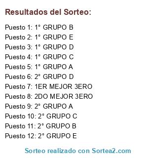 Lista de participantes: 1° GRUPO A, 2° GRUPO A, 1° GRUPO B, 2° GRUPO B, 1° GRUPO C, 2° GRUPO C, 1° GRUPO D, 2° GRUPO D, 1° GRUPO E, 2° GRUPO E, 1ER MEJOR 3ERO, 2DO MEJOR 3ERO.